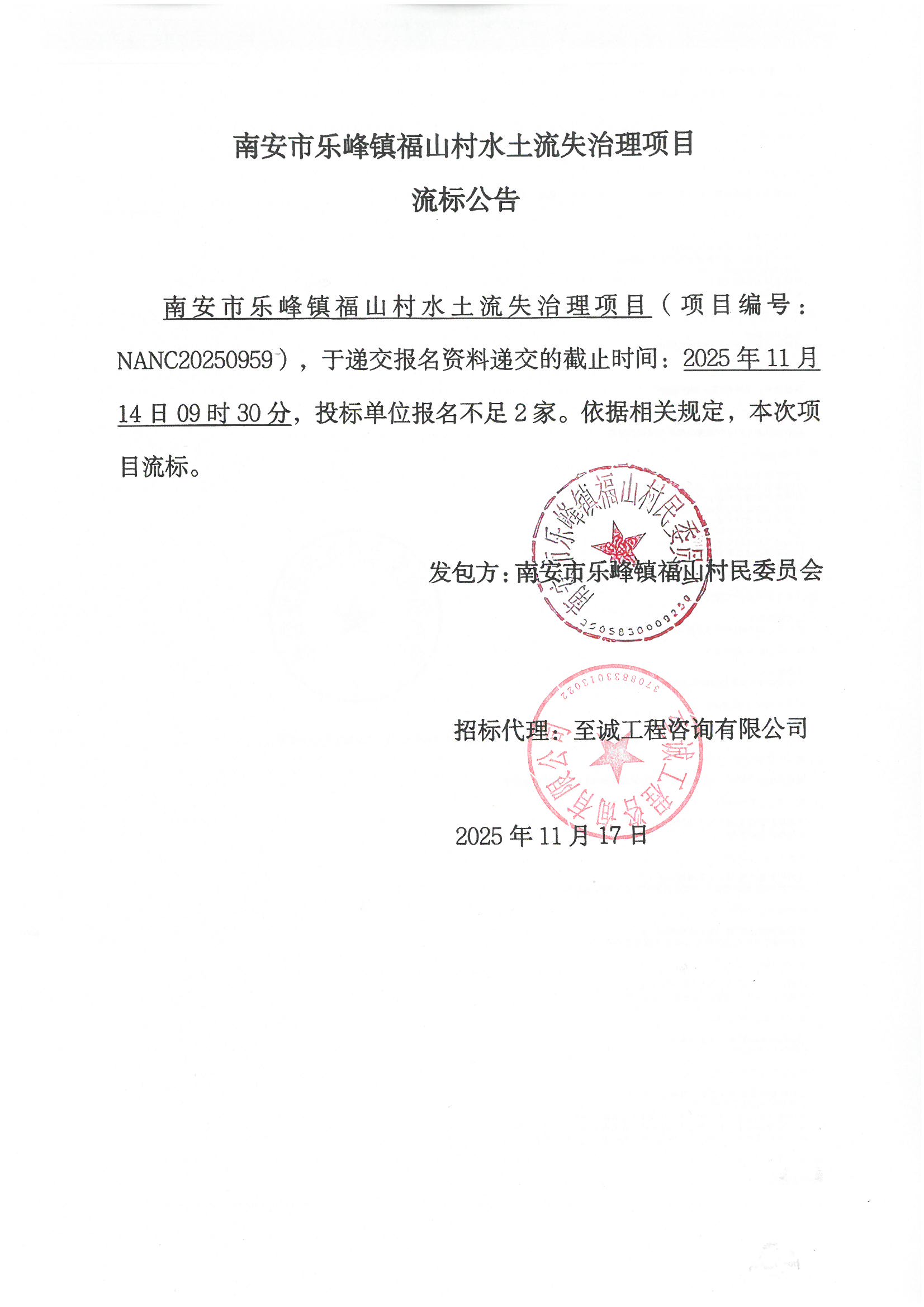 南安市乐峰镇福山村水土流失治理项目流标公告