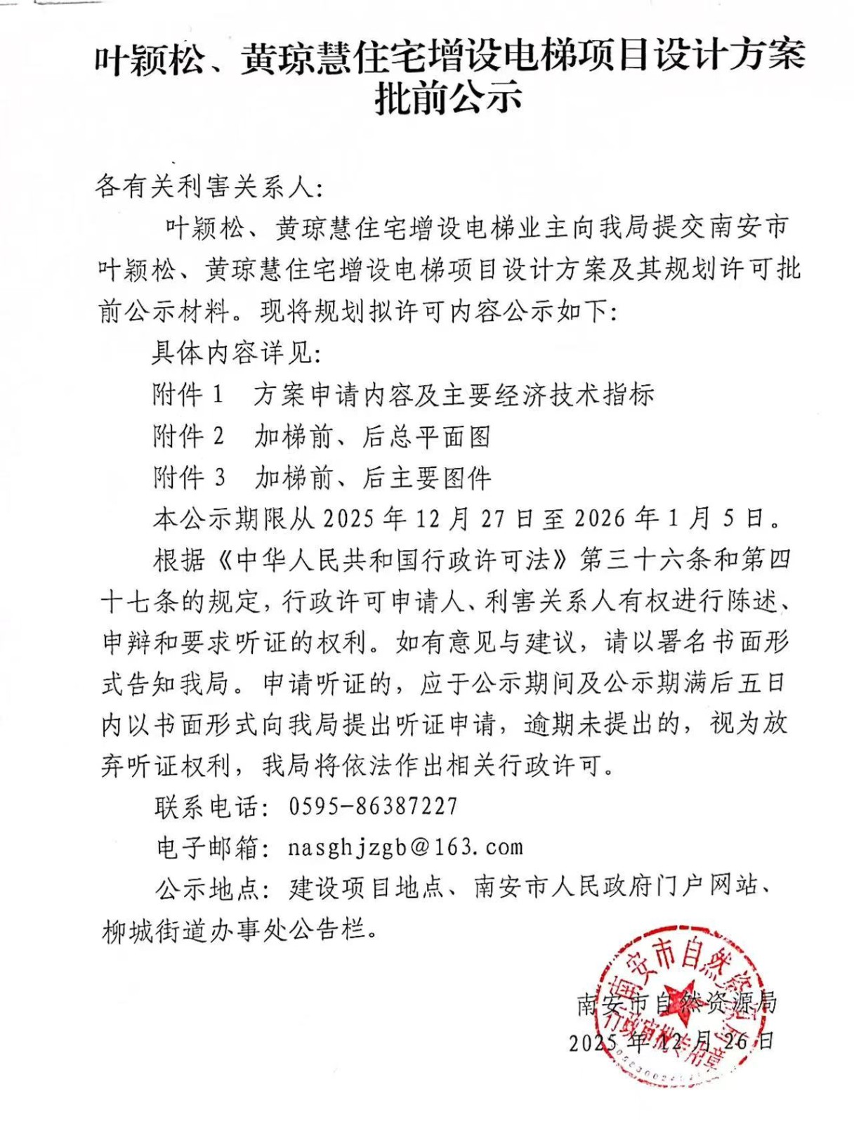 叶颖松、黄琼慧住宅增设电梯业主向我局提交南安市叶颖松、黄琼慧住宅增设电梯项目设计方案及其规划许可批前公示材料。现将规划拟许可内容公示如下:
