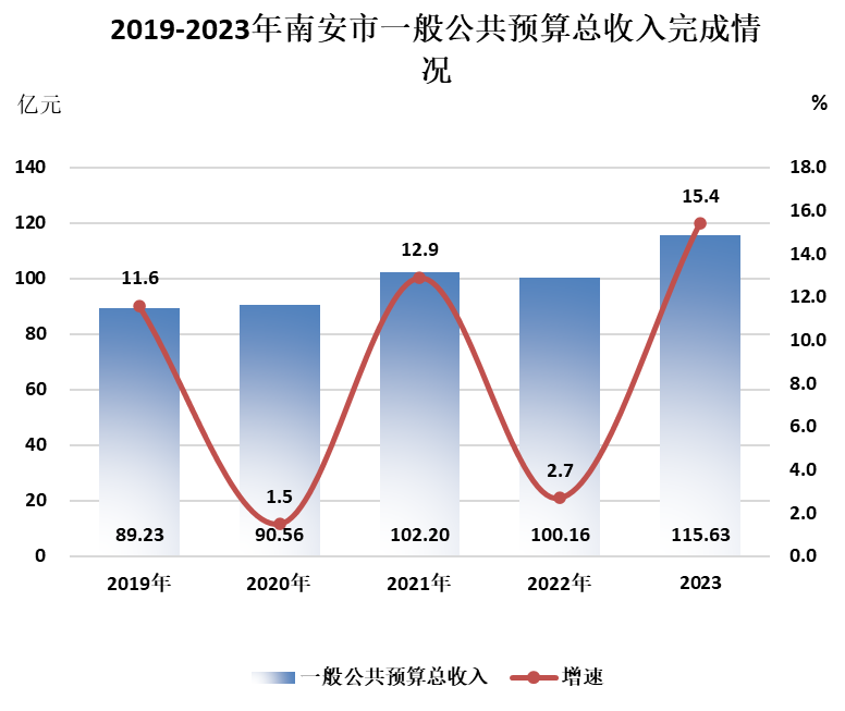 全年一般公共预算总收入115.62亿元,比上年增长15.4%。其中,一般公共预算收入74.31亿元,增长8.9%;中央财政收入41.31亿元,增长29.4%。全市一般公共预算支出106.17亿元,增长9.4%,其中:一般公共服务支出5.89亿元,下降8.7%;教育支出31.63亿元,增长11.5%;科学技术支出1.66亿元,下降21.7%;社会保障和就业支出17.95亿元,增长81%;卫生健康支出9.79亿元,增长8.9%。税收收入91.69亿元,下降16.2%。