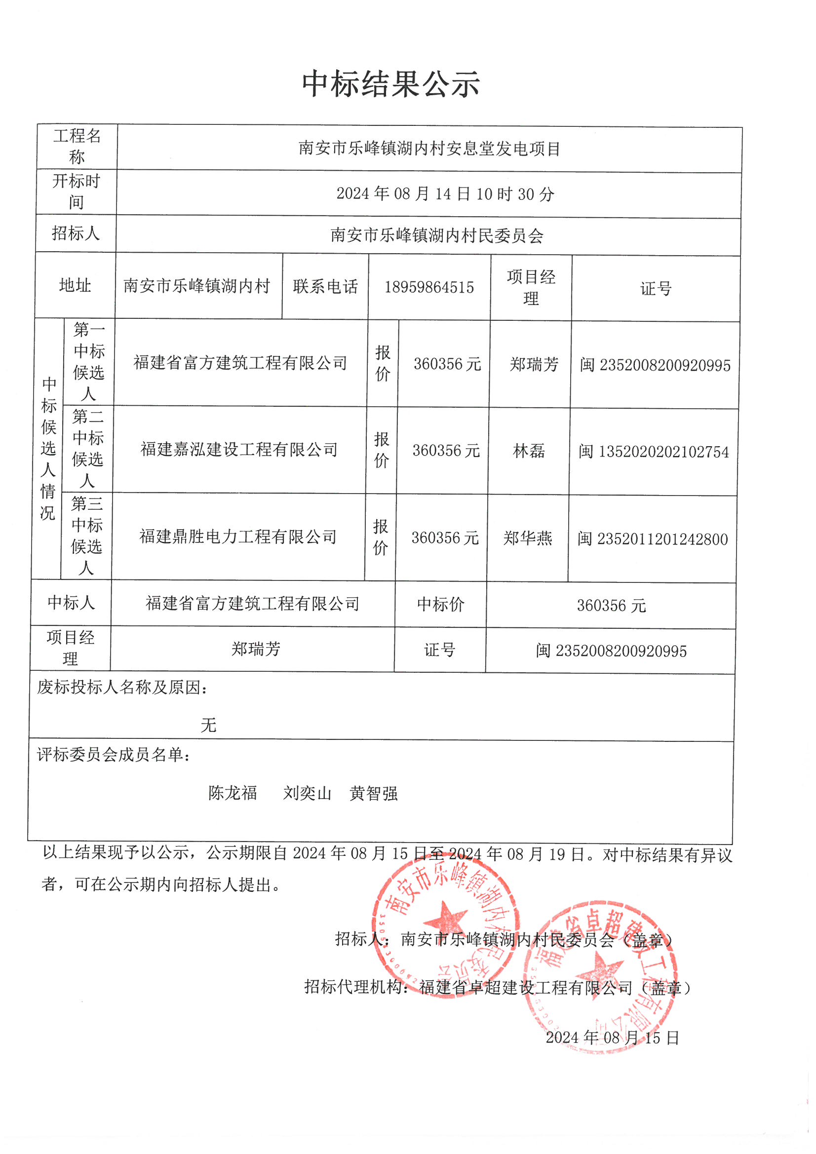 南安市乐峰镇湖内村安息堂发电项目的中标结果公示