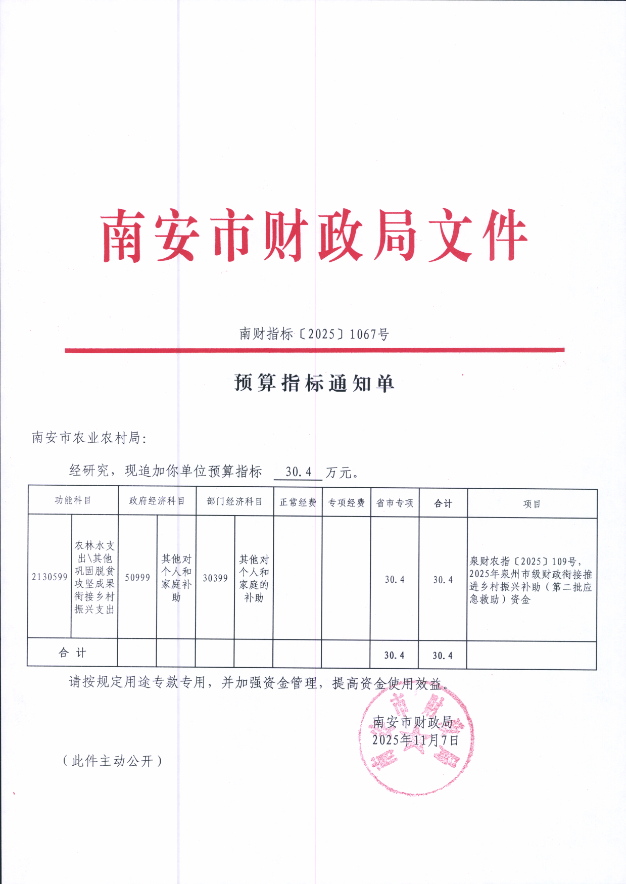 预算指标通知单【南财指标〔2025〕1067号】