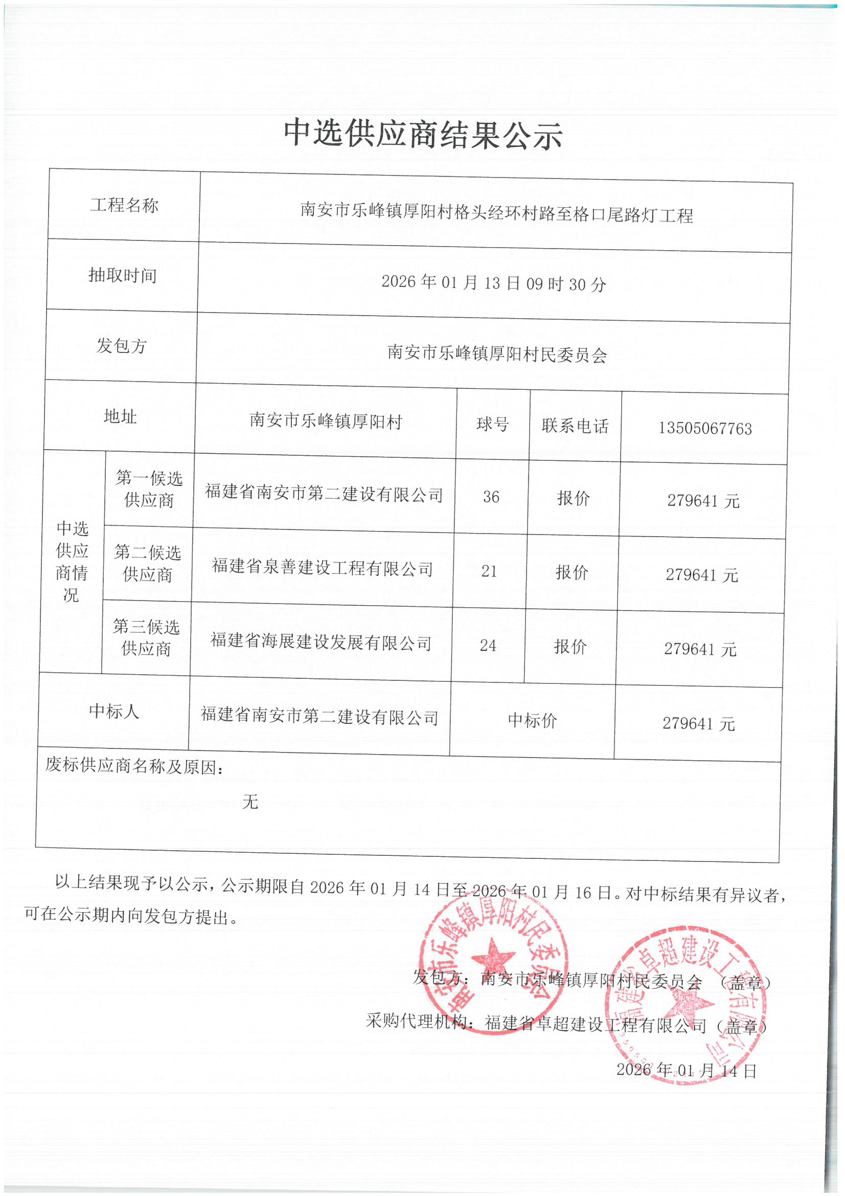 南安市乐峰镇厚阳村格头经环村路至格口尾路灯工程的中选供应商结果公示