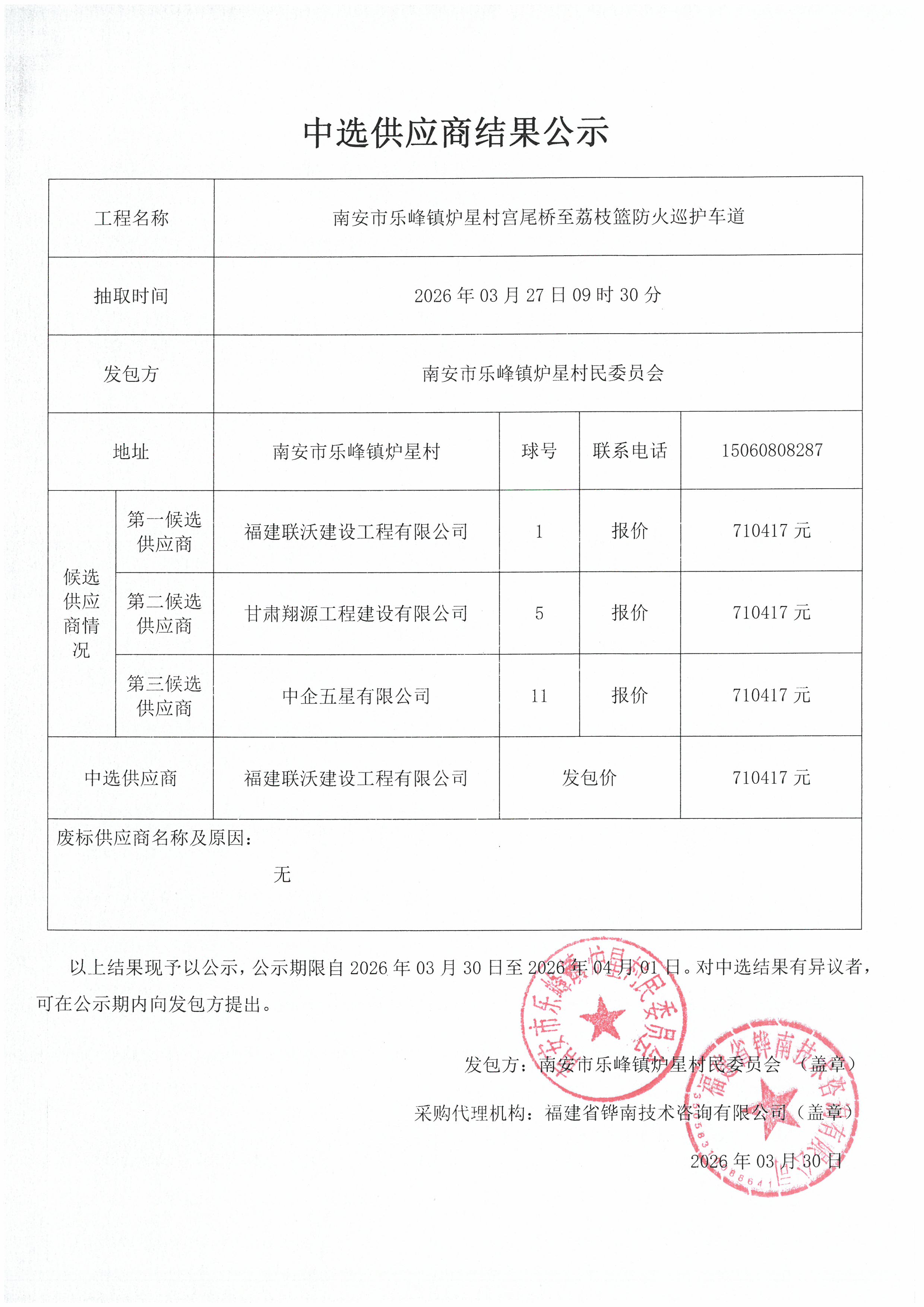 南安市乐峰镇炉星村宫尾桥至荔枝篮防火巡护车道的中选供应商结果公示