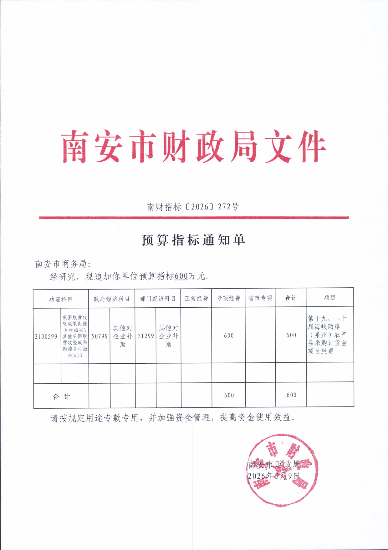 预算指标通知单【南财指标〔2026〕272号】
