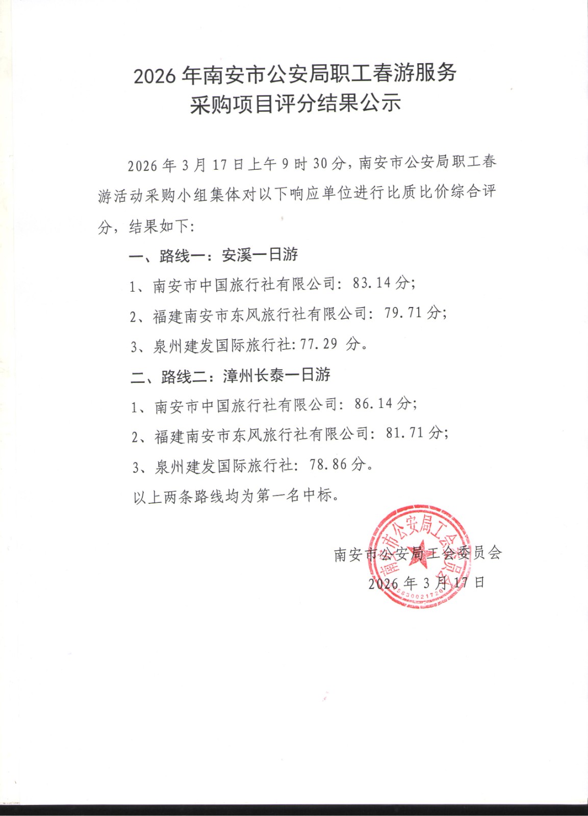 南安市公安局2026年职工春游服务采购项目评分结果公示