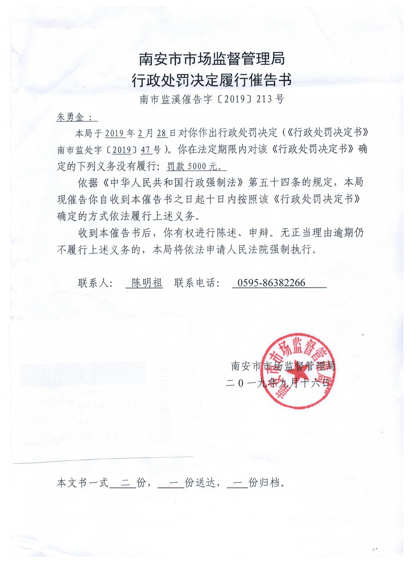 本局于2019年9月16日向朱勇金(身份号码:350322********3872)作出《行政处罚决定履行催告书》(南市监溪催告字〔2019〕213号),并直接送达到南安市溪美街道中山街50号由朱勇金经营的服装店,因该店已关闭,无法直接送达。随后通过邮政挂号信(条形码:XA37404685535)向朱勇金身份证所在地进行邮寄送达,但该邮政挂号信因收件人外出被退回。现依法向朱勇金公告送达《行政处罚决定履行催告书》(南市监溪催告字〔2019〕213号),自公告之日起满60日即为送达。公告同时在南安市市场监督管理局公告栏内张贴。