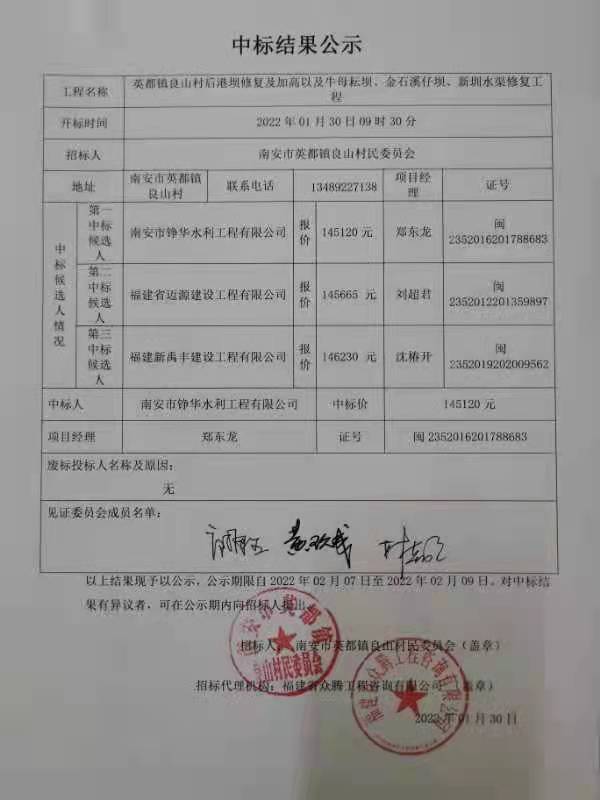 英都镇良山村后港坝修复及加高以及牛母耘坝、金石溪仔坝、新圳水渠修复工程中标结果公示