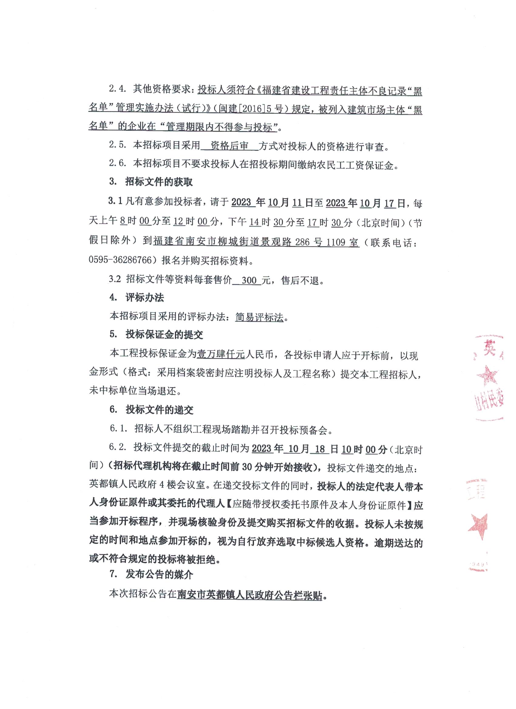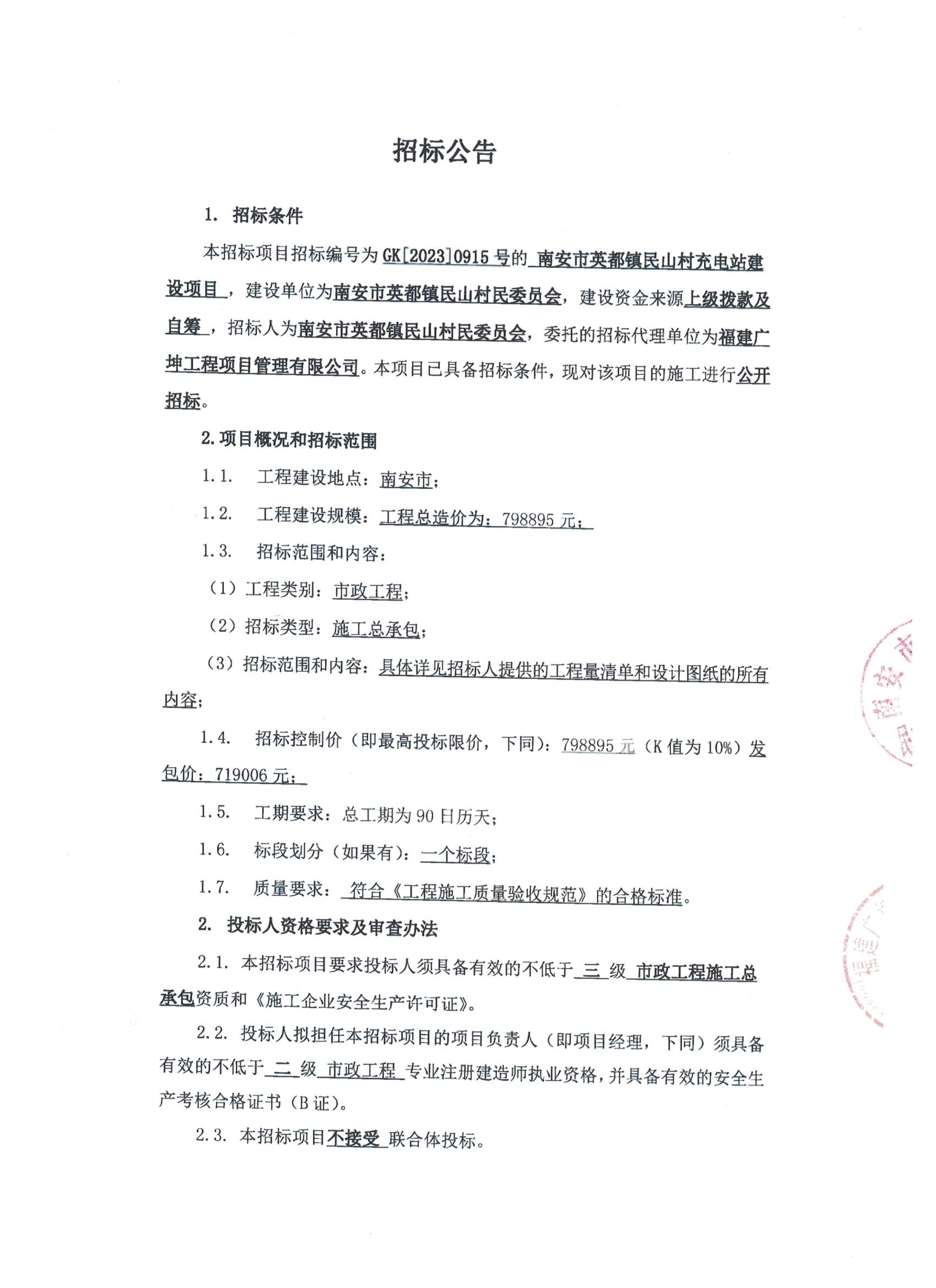 GK[2023]0915号南安市英都镇民山村充电站建设项目招标公告