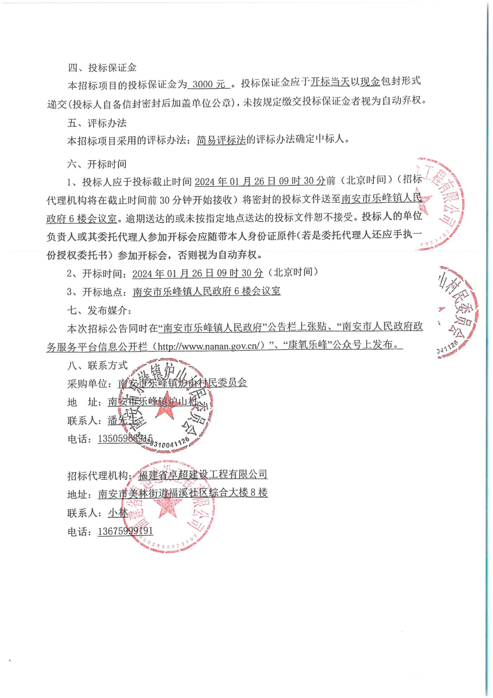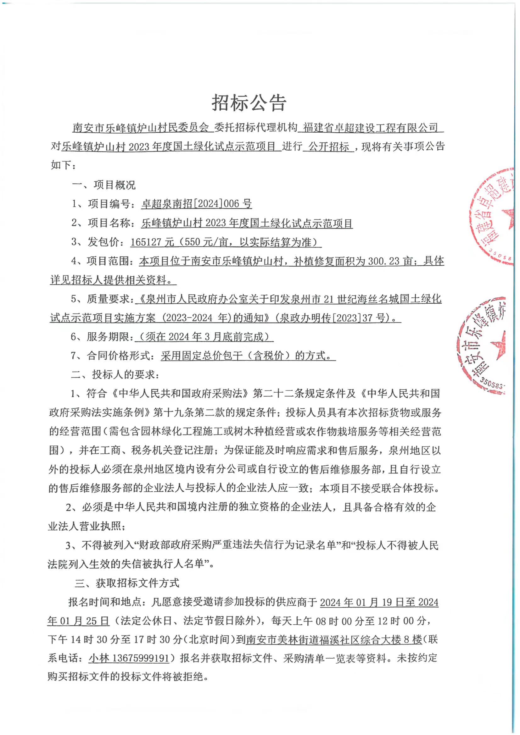 南安市乐峰镇炉山村2023年度国土绿化试点示范项目的招标公告