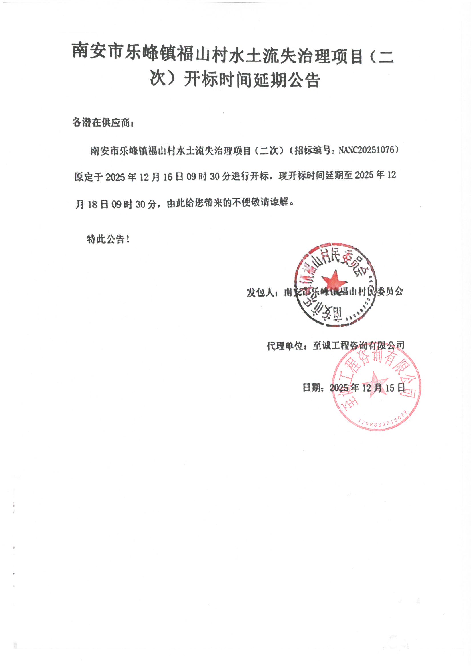 南安市乐峰镇福山村水土流失治理项目(二次)开标时间延期公告