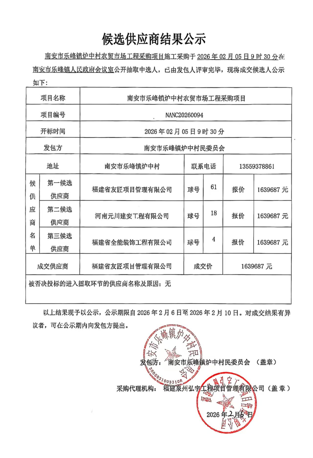 南安市乐峰镇炉中村农贸市场工程采购项目候选供应商结果公示