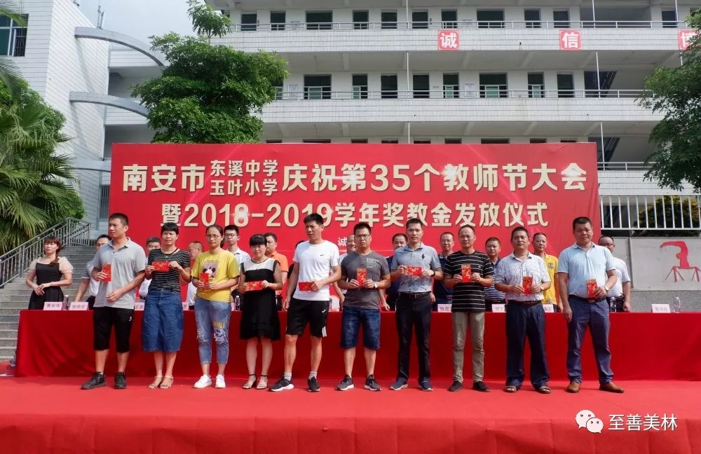 9月10日上午,东溪中学、玉叶小学庆祝第35个教师节表彰大会2018-2019学年奖教金发放仪式在东溪中学操场举行。此次活动共奖励了160多位教职员工,奖教金近32万元。美林街道党工委书记黄立新、美林街道党工委宣传委员黄绵绵、美林街道办事处副主任陈思孟等领导参加了表彰大会。