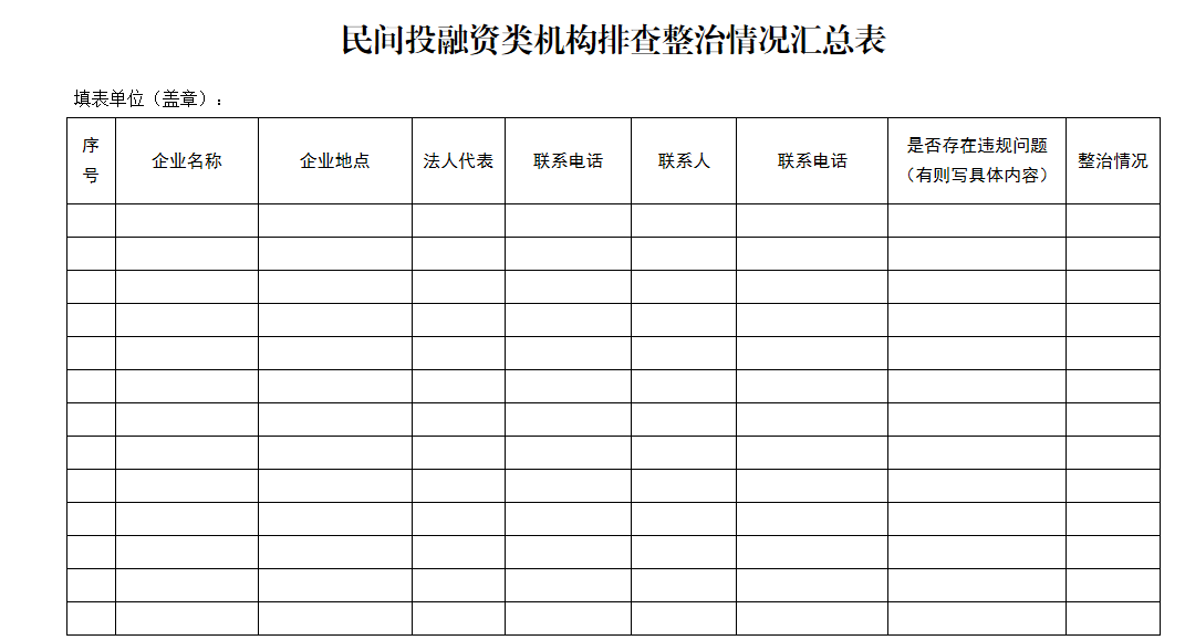 (三)及时报送工作总结。各乡镇(街道)人民政府(办事处),雪峰、经济开发区管委会,工作小组成员单位于5月14日前将排查整治工作情况和《民间投融资类机构排查整治情况汇总表》(附件3,各乡镇、街道、开发区不用报送)书面报送至市财政局。排查整治工作情况内容包括但不限于排查整治开展情况、行业风险现状、突出问题、工作处置措施、下一步工作计划等。